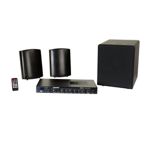 The system includes a USB and SD playback module that you can download hours of MP3 files to, so that no phones or MP3 players need to be hooked up. Also included with the amplifier is a mini jack-to-jack cable that you can use with personal MP3 players and smartphones as the music playback source, if you so wish. There's a USB Charging Port on the amp's back panel so by using your USB charging cable you can charge a device when it's playing.