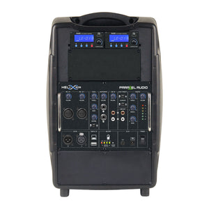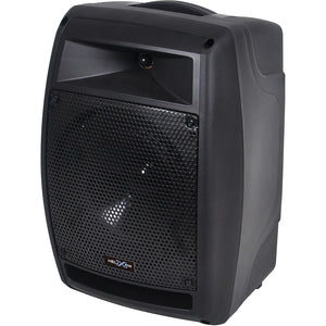 This portable sound system may be small but it's loud with 150 watt pure Class D power to its bi-amped 8" 2-way speaker system. It's AC or DC battery powered giving up to 6 hours of playtime from the standard lead/acid battery. It has a smart charging circuit with a 4-step battery LED indicators and charging LED. It comes with one UHF True Diversity Receiver module fitted, with the option for more to be added. It has a 3-band EQ and an auto-limiting circuit to protect the amp and speakers.