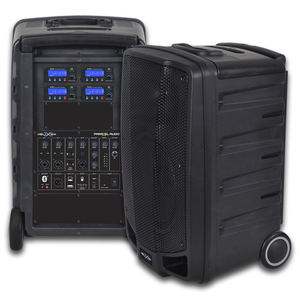 This portable sound system may be small but it's loud with 250W of pure Class D power to its bi-amped 10" 2-way speaker system. It's AC or DC battery powered giving up to 6 hours of playtime from the standard lead/acid battery. It has a smart charging circuit with a 4-step battery LED indicators and charging LED. It comes with one UHF True Diversity Receiver module fitted, with the option for more to be added. It has a 3-band EQ and an auto-limiting circuit to protect the amp and speakers.